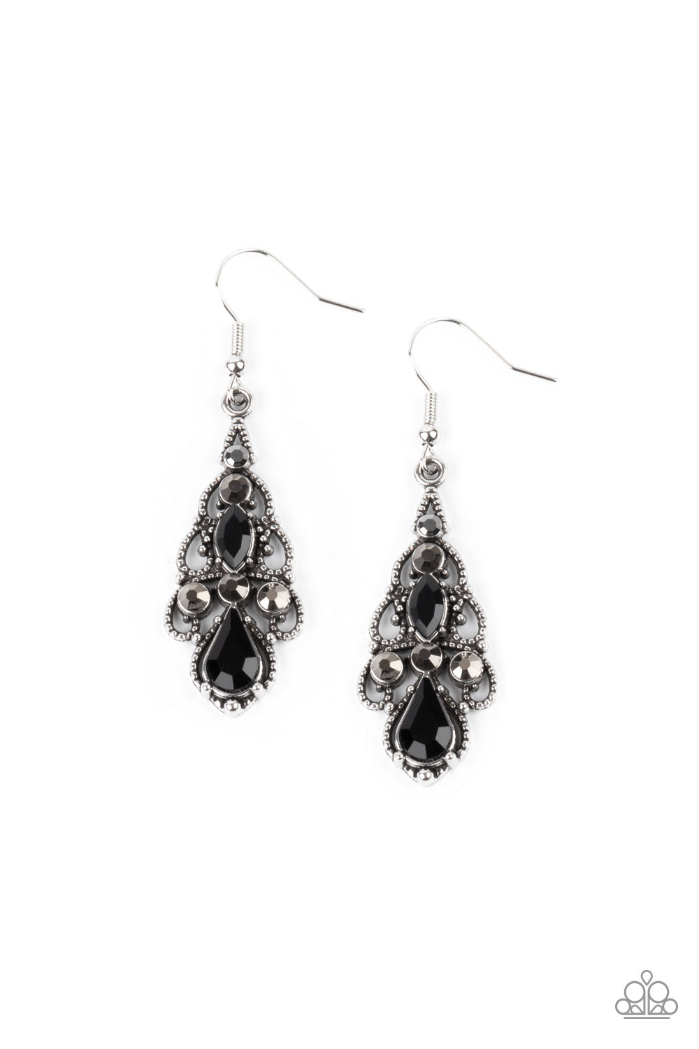 Embellished in mismatched black and hematite rhinestones, studded silver filigree swirls into an airy chandelier, creating a regal lure. Earring attaches to a standard fishhook fitting.