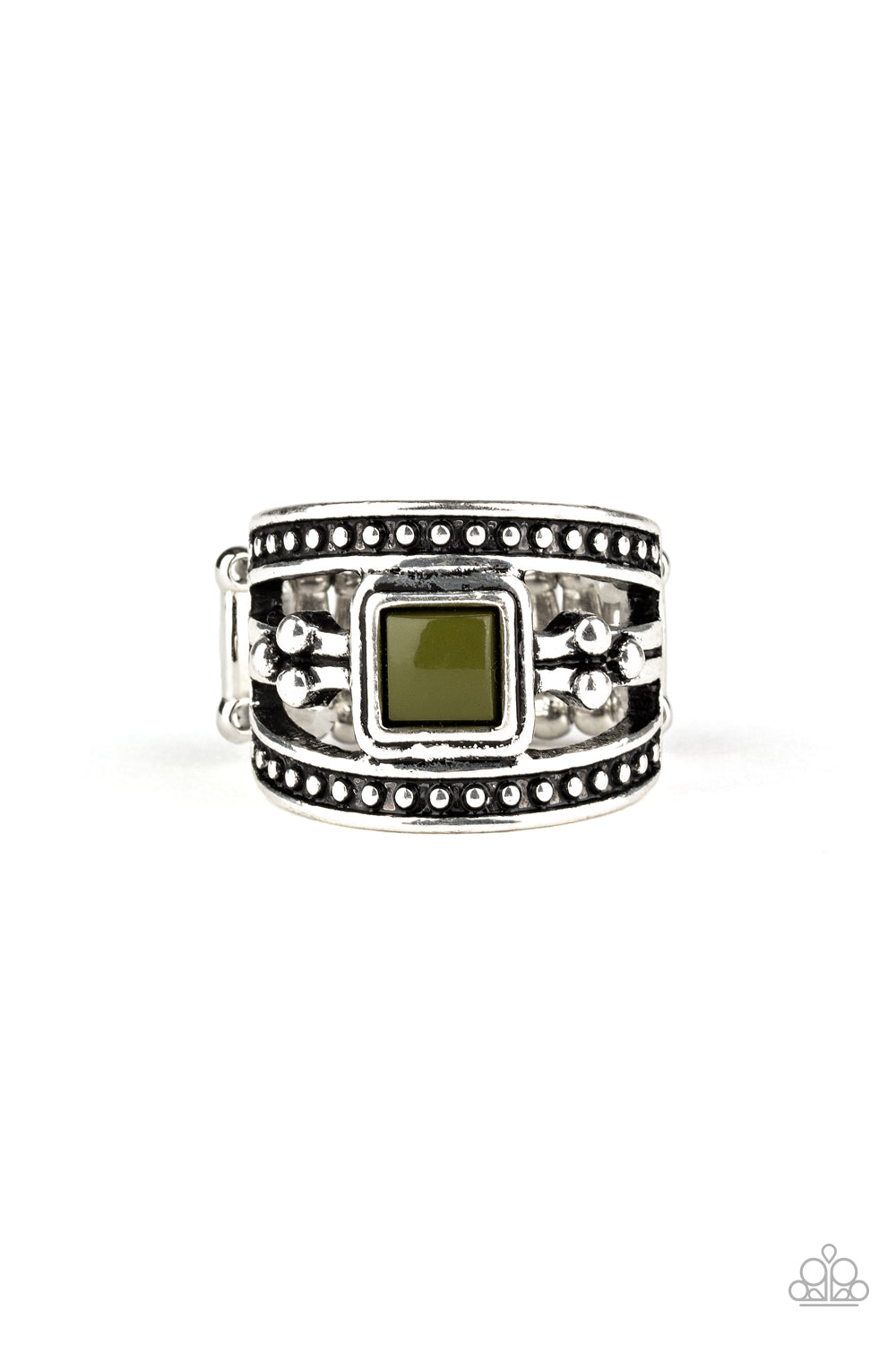 Flanked by studded silver bands, a square green bead dots the center of a studded center band, creating a colorfully layered band across the finger. Features a stretchy band for a flexible fit.