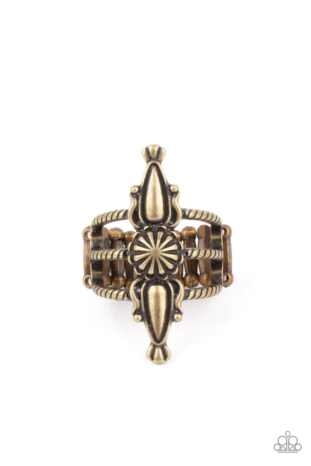 An antiqued brass flower frame is flanked by two decorative brass teardrop frames, creating a rustic centerpiece atop three textured brass bands. Features a stretchy band for a flexible fit.