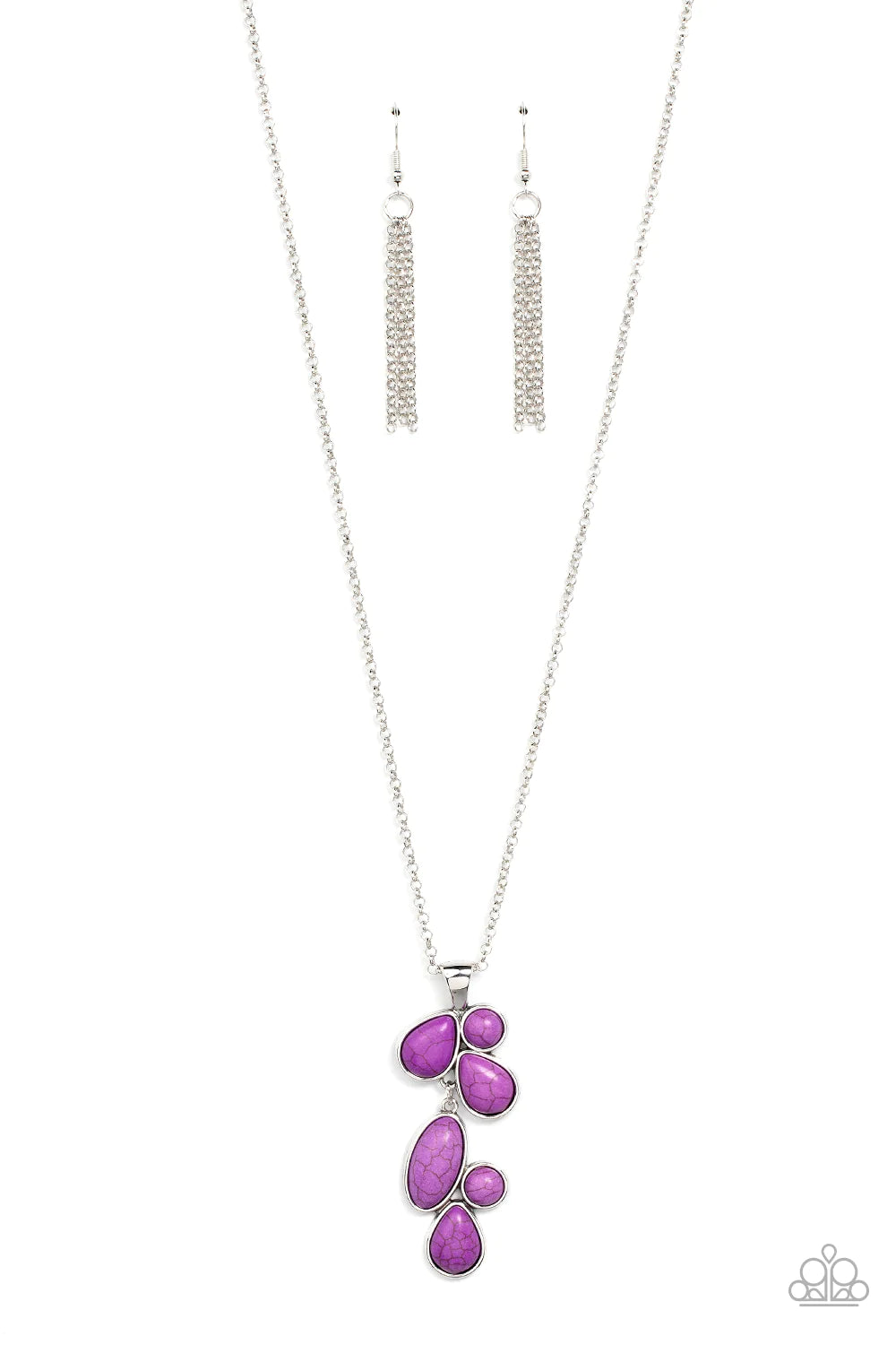 Encased in sleek silver frames, a vivacious collection of purple round, oval, and teardrop frames link into a whimsical pendant at the bottom of an extended silver chain. Features an adjustable clasp closure.