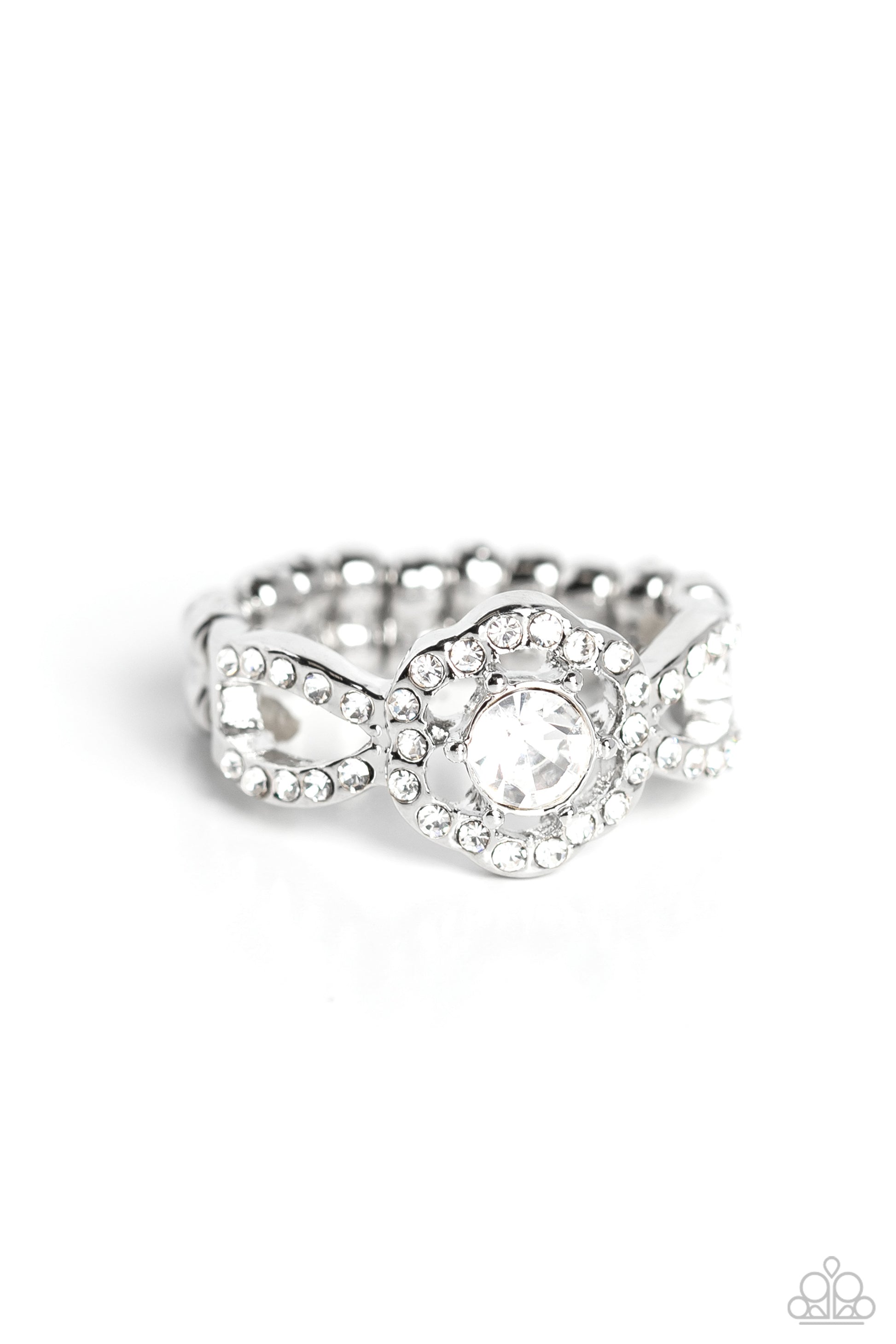 Layers of sparkly rhinestone-encrusted silver bands curve and border a rhinestone-encrusted silver flower with a radiant white gem center, creating an elegant centerpiece atop the finger. Features a stretchy band for a flexible fit.