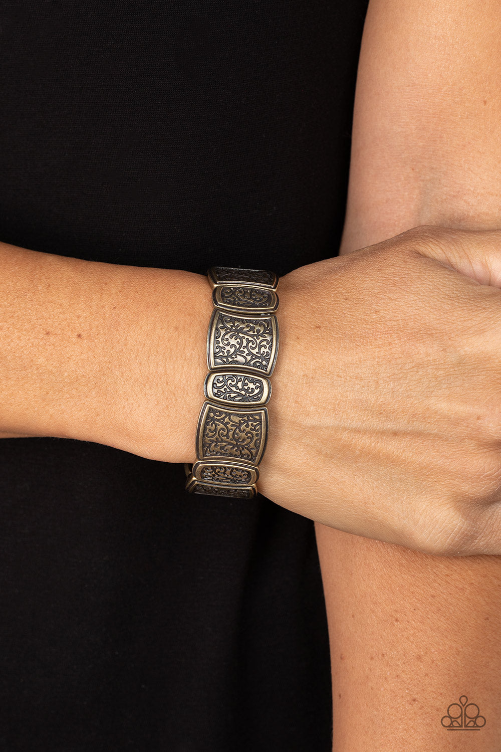 Stamped in an antiqued vine motif, mismatched brass frames delicately alternate along stretchy bands around the wrist for a rustic flair.