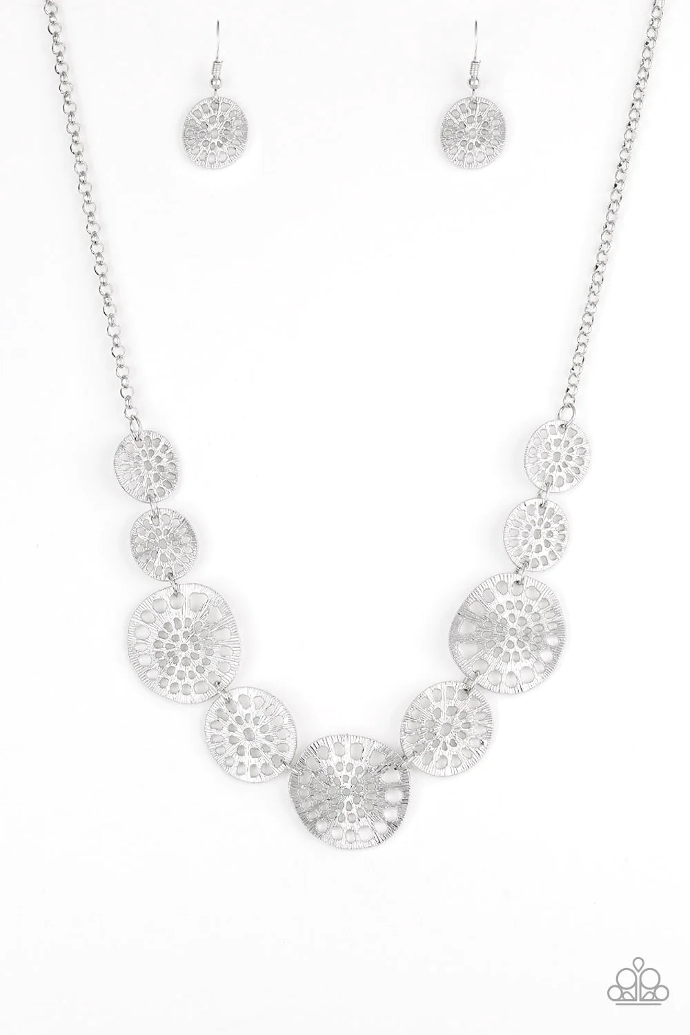 Featuring airy stenciled patterns, shimmery silver discs link below the collar for a whimsical asymmetrical look. Features an adjustable clasp closure.